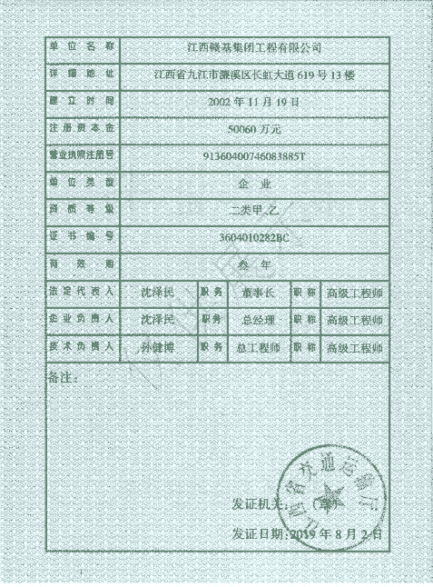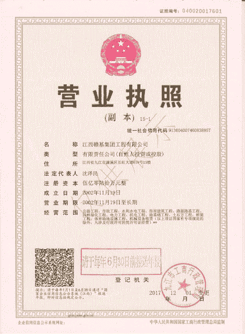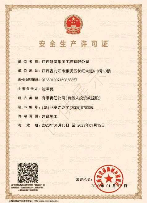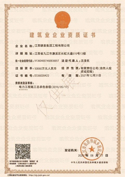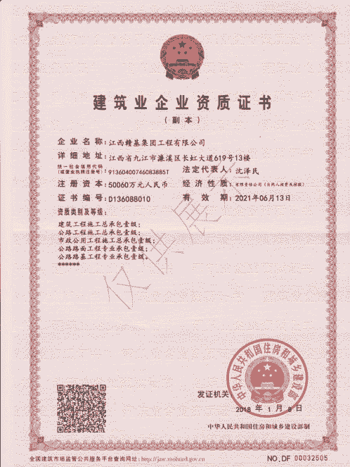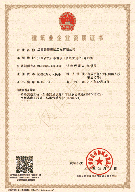 江西贛基集團(tuán)工程有限公司是國家壹級施工總承包企業(yè),具有公路工程、市政公用工程、房屋建筑工程總承包壹級資質(zhì);公路路基、路面專業(yè)壹級;水利水電工程、電力工程、城市園林綠化、公路養(yǎng)護(hù)工程貳級資質(zhì)。